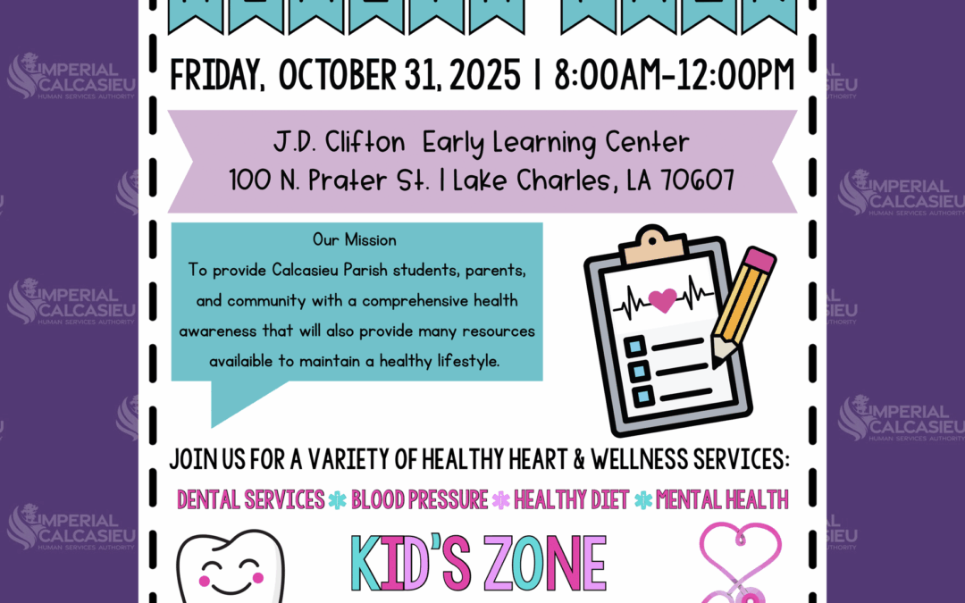 Calcasieu Parish Head Start Health Fair Oct 28, 2025 🟣 Calcasieu Parish Head Start Department’s Annual Health Fair 🎉 Health Fair 2025 📅 Friday, October 31, 2025 🕗 8:00 AM – 12:00 PM 📍 J.D. Clifton Early Learning Center 100 N. Prater St., Lake Charles, LA 70607