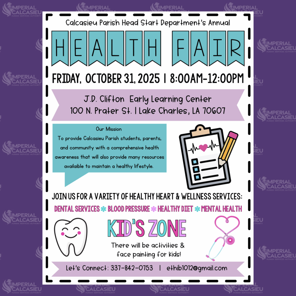 Calcasieu Parish Head Start Health Fair MCMO Office 19 hours ago 🟣 Calcasieu Parish Head Start Department’s Annual Health Fair 🎉 Health Fair 2025 📅 Friday, October 31, 2025 🕗 8:00 AM – 12:00 PM 📍 J.D. Clifton Early Learning Center 100 N. Prater St., Lake Charles, LA 70607