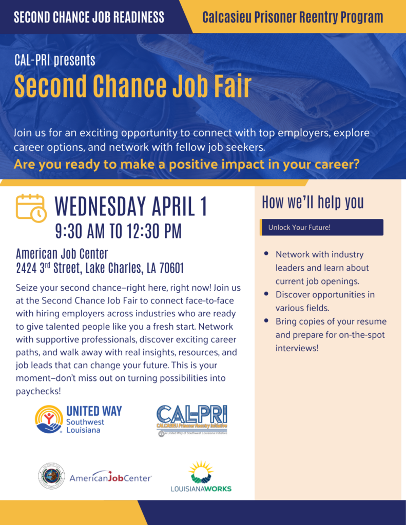 Second Chance Job Fair MCMO Office 4 weeks ago Join us for the Second Chance Job Fair hosted by CAL-PRI 📅 April 1 ⏰ 9:30 AM – 12:30 PM 📍 American Job Center – Lake Charles Bring your resume and be prepared for on-the-spot conversations with employers.